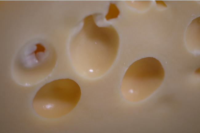 穴あきの見た目がイラストチーズのよう、ひと玉100kgにもなる大型ハードチーズ。こちらはモンベリヤー種の牛の生乳で作られ、ラベルルージュやラベルサヴォア、グランクリュー等の品質保証をされた商品です。