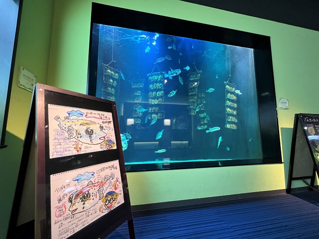 また、水槽前には2匹のイシガキフグの特徴がわかる、さかなクン直筆の紹介ボードも設置しました。