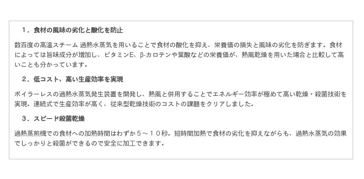 『過熱蒸煎機』は、食品の風味の劣化と酸化、栄養価の減少を抑えながら、乾燥と殺菌を同時に行うことが可
