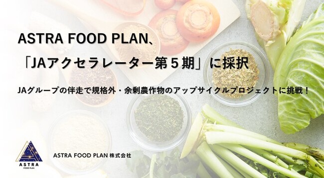 「サスティナブルな社会の実現」をミッションに掲げるフードテックベンチャーのASTRA FOOD PLAN 株式会社(埼玉県富士見市、代表取締役:加納 千裕 以下ASTRA FOOD PLAN )は、2023年5月25日に開催されたJAグループが主催するビジネスプランコンテストにて「優秀賞」を受賞し、「JAアクセラレーター第5期」(以下、本プログラム)に採択されました。