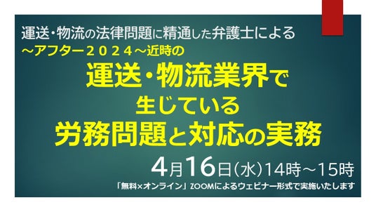 運送・物流業の法律問題に精通している弁護士が、「労務問題」をテーマにしたセミナーを無料・オンラインで開催させていただきます。