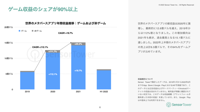 世界のメタバースアプリの総収益は、2020年に激増し、最終的に12.6億ドルを越え、2019年からは112%増となりました。この増加傾向は2021年も続き、過去最高となる15.1億ドルに達しました。2022年上半期のメタバースアプリの売上は計6.5億ドルで、その94%をゲームアプリが占めています。