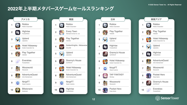 2022年上半期、『Roblox』はアメリカ、韓国、日本および東南アジア等多くの地域でメタバースゲームダウンロードランキングおよびセールスランキングの第1位を獲得しました。