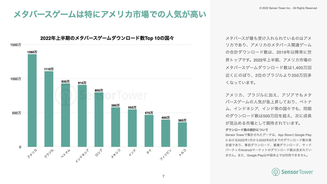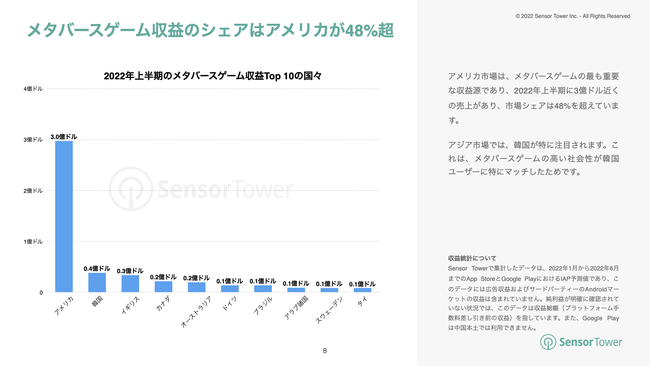 アメリカのメタバースゲームのダウンロード数と収益は、引き続き他の地域をリード