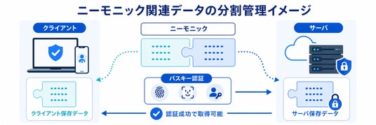 秘密鍵復元に必要な 「ニーモニック(シードフレーズ) 」に関連するデータを、サーバとクライアントに分割して保存し、サーバのデータはパスキー認証に成功することで取得可能となります。