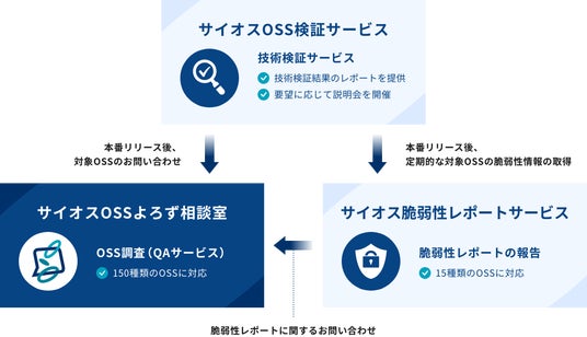 サイオステクノロジーは、2007年よりOSSサポートサービス「サイオスOSSよろず相談室」の提供を通じて、顧客企業ごとに最適なOSSの活用を支援しています。このたび、さらなる企業のOSSに関する課題解決やセキュリティリスクの不安を解消し、安心・安全なOSSの利活用を支援する新たなサービスメニューとして、「サイオスOSS検証サービス」「サイオス脆弱性レポートサービス」を提供することとなりました。