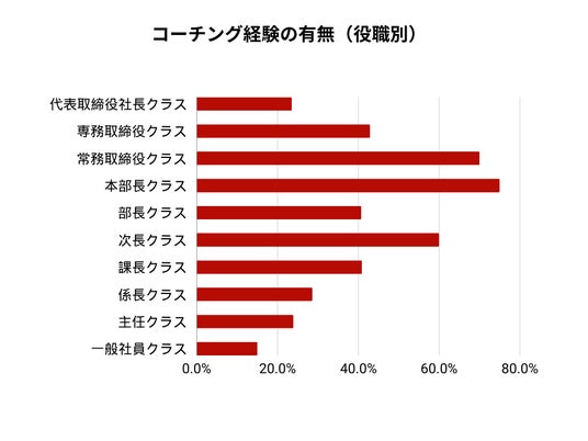 - コーチング経験者の常務取締役クラスの70%が「コーチングが役に立った」と回答し、一般社員クラスは6%のみが「コーチングが役に立った」と回答