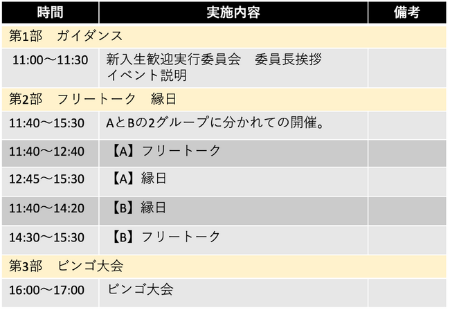 当イベントは、3 部制で行います。第 1 部では、イベント趣旨についてのガイダンスを行います。 第 2 部では、先輩学生との交流を通して大学生活の不安や悩み解消を行う「フリートークコーナー」と模擬店やゲームコーナーで参加者同士の交流を深める「縁日」を行います。第3部では、ビンゴ大会を行います。新入生が大学生として初めての夏休みを満喫してもらえるよう、夏に関連した 景品や、大学生活に役立つような景品をプレゼントする予定です。