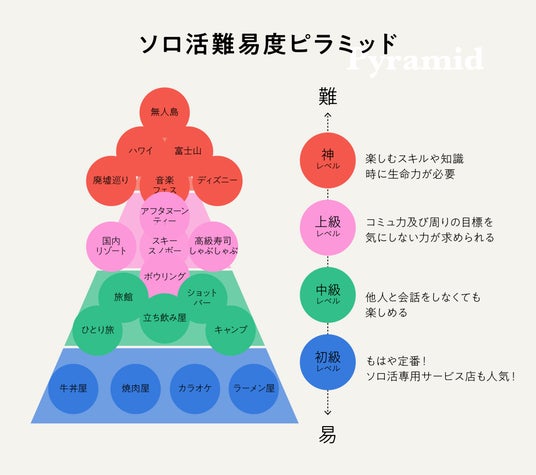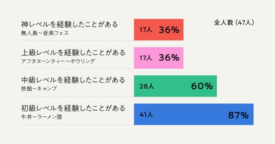上記の難易度ピラミッドを掲示して具体的な活動レベルを聴取した結果は、「神レベル」で36%と3人に1人以上が経験済み、中級レベルも60%が経験済みであり、回答者の多くがあまり一人で出かけないように思えるお一人様難易度が高い内容を経験しています。