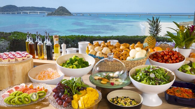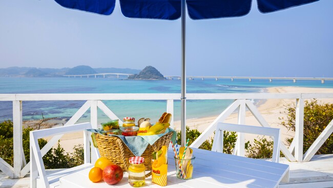 夕食は地元山口県の新鮮な海と山の食材を取り入れた約70種類のお料理をお好きなだけ、また朝食ではバスケットにお料理を詰めて、外のテラス席や目の前のビーチで召し上がることもできます。