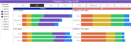 ルート毎にこれらのリードタイムを月次で色分けしたグラフに表し、物流チーム内で定期的に共有することで、「どの区間で時間がかかっているか」「どの航路・キャリアでばらつきが大きいか」が一目で分かるようになりました。