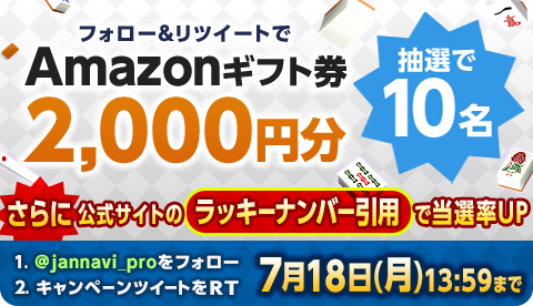 2022年7月8日(金)よりオンライン麻雀アプリ「ジャンナビ麻雀オンライン」twitter公式アカウントにて抽選でamazonギフト券2000円分を10名様にプレゼントするキャンペーンを実施いたします。