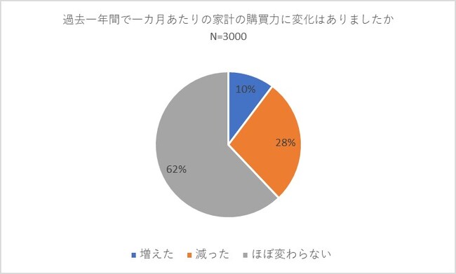 また、全員に「過去一年間で一カ月当たりの家計の購買力に変化はありましたか」と尋ねたところ約3割の方が、「減った」(28パーセント)と回答しました。「増えた」との回答は10パーセント、最も多くの回答を集めたのは「ほぼ変わらない」(62パーセント)でした。