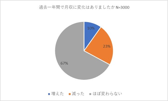 まず全員に「過去一年間で月収に変化はありましたか」と質問したところ、「増えた」が10パーセント、「減った」が23パーセント、「ほぼ変わらない」が67パーセントとの回答になりました。