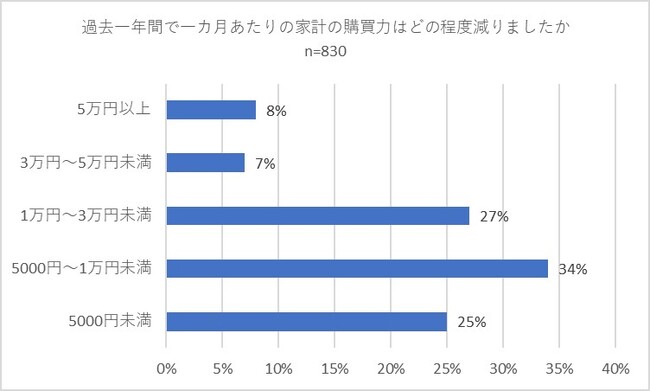 前設問で購買力が「減った」と回答した830人に対し、「過去一年間で一カ月あたりの家計の購買力はどの程度減りましたか」との質問を行ったところ、「5000円~1万円未満」が34パーセントで最多の回答を集めました。2位は「1万円~3万円未満」(27パーセント)、3位は「5000円未満」(25パーセント)との結果になりました。