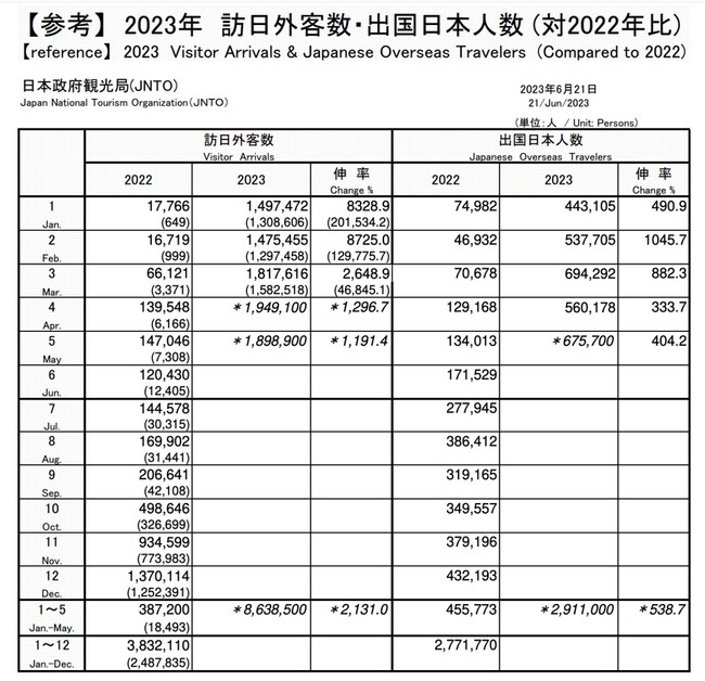 昨年2022年に比べ2023年は、日本を訪れる外国人も、海外へ出かける旅行者もコロナ前の2019年に回復傾向にあります。