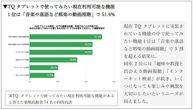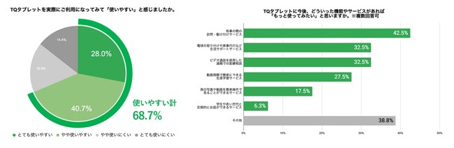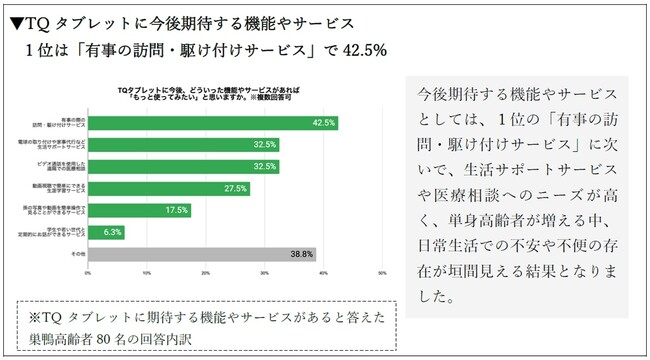 また、TQ タブレットに期待する機能やサービスがあると回答した人を対象に、その内容を伺ったところ、1位は「有事の訪問・駆け付けサービス」で42.5%、同率2位は「電球の取り付けや家事代行など生活サポートサービス」「ビデオ通話を使用した遠隔での医療相談」で32.5%となり、日常生活での不安や不便に対するニーズが垣間見えました。