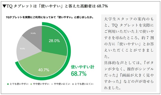 この度TQコネクト株式会社は、9月14日(木)から9月18日(月・敬老の日)までの5日間、大正大学 社会共生学部 社会福祉学科が巣鴨地蔵通り商店街にて主催した、落語やシニアネイル、学生とのおしゃべりでシニアを笑顔にする「巣鴨笑店街カフェ」に協賛しました。そこで巣鴨の高齢者118名(60代51名、70代47名、80代18名、90代2名)を対象に「スマートフォンやタブレットに関するアンケート」調査を実施。大学生スタッフの案内のもと、実際に巣鴨の高齢者の方々にTQタブレットを操作いただいた上でご回答いただいたところ、約7割の高齢者に「TQタブレットは使いやすい」とお答えいただきました。