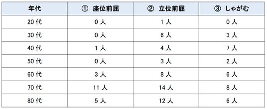 これは、腰痛や椎間板ヘルニアなどのリスクを高める要因ともなり得ます。したがって、日常生活の中で無意識に行う動作に対しても、正しい体の使い方を意識することが、腰痛予防・健康寿命の延伸に繋がることが本調査から示唆され、特に高齢者には「しゃがむ動作」を無理なく行えるような筋力維持やストレッチ、生活環境の見直しが必要とされます。