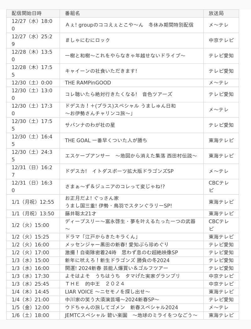 ・参加局:東海テレビ放送、中京テレビ放送、CBCテレビ、メ~テレ、テレビ愛知
