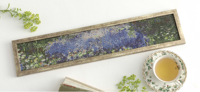 モネの睡蓮をイメージしたオリジナル図案を刺し子で楽しむアートシリーズ。モネの睡蓮の色合いを段染めで表現した刺し子糸を使用し、絵を描くように自由に刺しあげます。