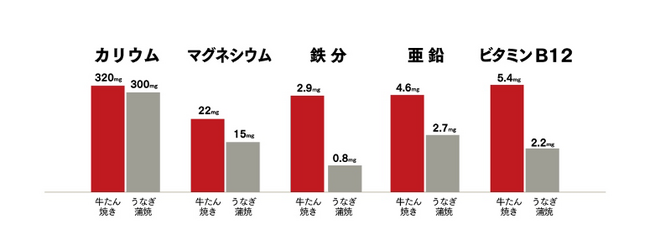 牛たんは、ウナギと同じくビタミンB1・B2が含まれているだけでなく、ビタミンB12、カリウム、マグネシウム、鉄、亜鉛にいたってはウナギより豊富に含まれています(下図参照)。