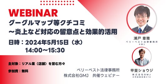 この度、株式会社GMJ(東京都港区愛宕2-5-1愛宕グリーンヒルズMORIタワー34階代表取締役:高本誠也、公式サイト:https://gmj.ne.jp)は、ベリーベスト法律事務所(東京都港区六本木1-8-7、代表:酒井 将、公式サイト:https://www.vbest.jp)と共同で、2024年5月15日「Google Map等クチコミ~対応の留意点と効果的活用」したウェビナーを開催いたします。