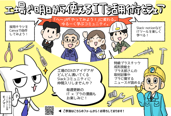 化学産業に特化したサービスを展開するSotas株式会社(所在地:神奈川県川崎市、代表取締役社長:吉元 裕樹、以下「当社」)は、当社のアドバイザーである特級プラスチック成形技能士のプラ太郎氏とともに、プラスチック加工会社の経営者・技術者の皆様に向けて、業務で使えるデジタルツールの紹介や、現場におけるDXの成功事例の共有など、工場で活用できるITをシェアするコミュニティ「2030となりのプラ工場」の運営を開始します。
