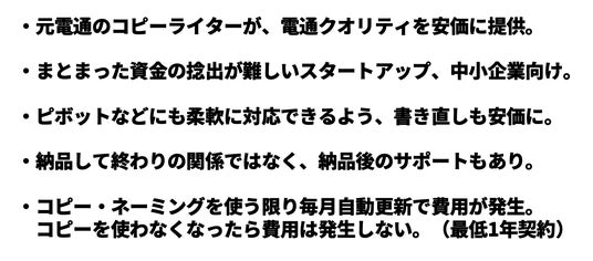 クリエーティブの世界は、高額にも関わらず、納品したら終わり、その後再度発注するときには、再度高額の費用がかかる、ということが一般的です。私自身、広告代理店時代に感じていた「つくって終わり」という関係性への疑問と、スタートアップ起業家として限られた費用の中からプロモーション費用を捻出しなければいけない経営の経験から、このサービスを立ち上げました。初期費用を安価に抑えながらも、その後もコピーやCMを使い続ける限りはパートナーとして取引関係が続く。導入いただく企業様とは、チームとして伴走できる関係を構築していければと思います。