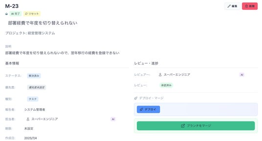 - タスク単位でAIが自動対応:タスクごとに専用ブランチが生成され、開発作業を個別に管理