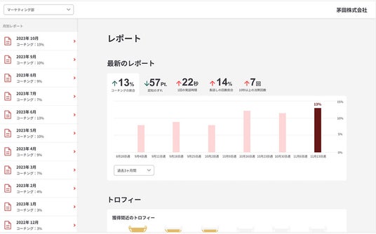 「理想の発話時間○回実施」など、特定条件の達成でトロフィーが得られる機能です。ゲーミフィケーションのノウハウを生かした定着支援機能です。