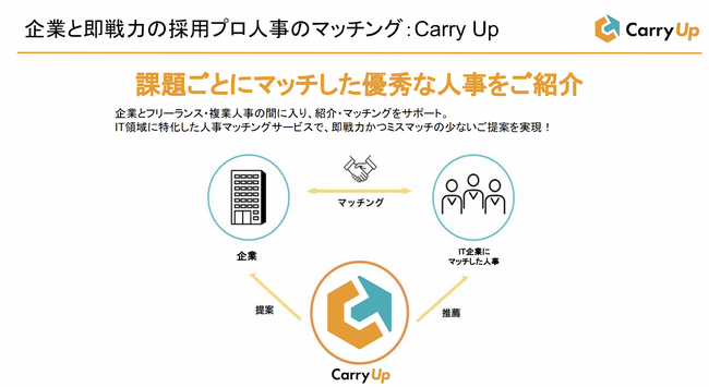 「Carry Up」とは、企業とフリーランス・複業人事の間に入り、マッチングをサポートするサービスです。IT企業の領域に特化しており、即戦力かつミスマッチの少ない人材を提案することができます。