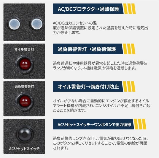 この2つのモデルは、安全性と利便性を追求し、厳しい品質基準をクリアした製品です。過負荷保護やオイル不足保護などの安全機能を標準装備しており、安定した電力供給を保証します。JESIMAIKはこれらの製品を通じて、安全で信頼性の高い電源ソリューションを提供し続けることを約束します。災害対策や停電時においても、これらの発電機があれば、あなたのビジネスや家庭生活を強力にサポートします。