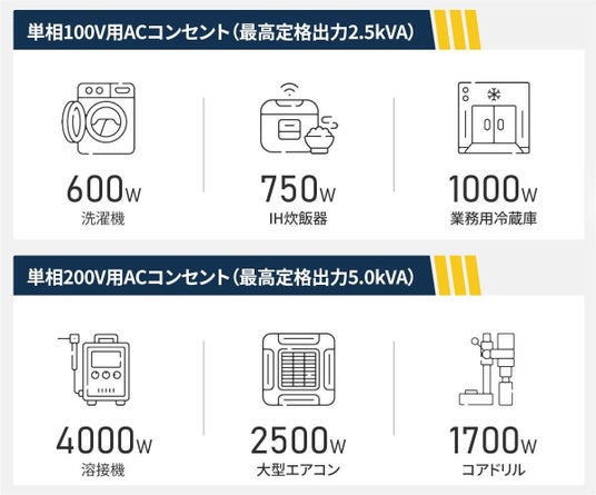 JM6000XiEは、5.0kVA(5000W)の高出力を誇り、100Vと200Vの同時出力が可能で、大型エアコンや業務用機器などもスムーズに稼働させられます。