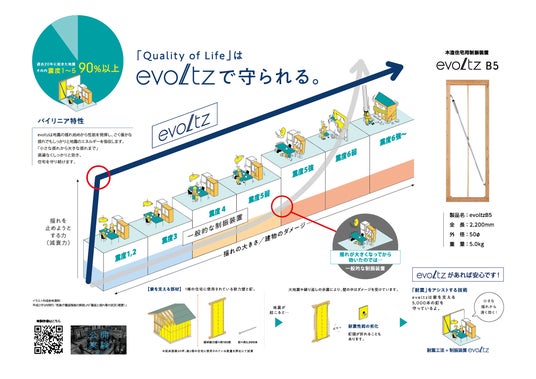 「evoltz」は震度1程度の小さな揺れにも効果を発揮する特許技術「超バイリニア特性」と高いエネルギー吸収量を備え、建物の揺れを抑制して構