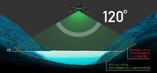 しかし、グリーンレーザーは水に吸収されにくい性質を持っており、水中への透過性に優れています。この特性により、陸上の測量はもちろん、濡れた地面や水が撒かれた施工現場、河川や浅海域、ボートが入れない狭小水域、さらには水害発生直後の緊急現場においても、確実なデータ取得が可能になります。