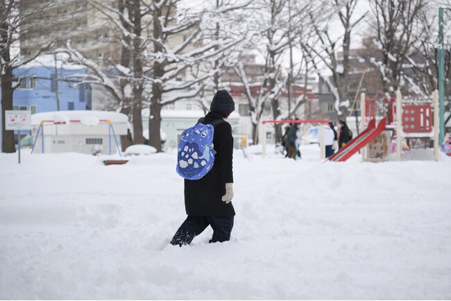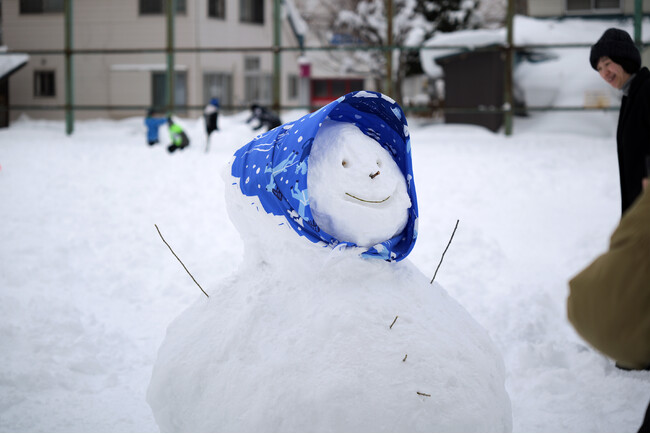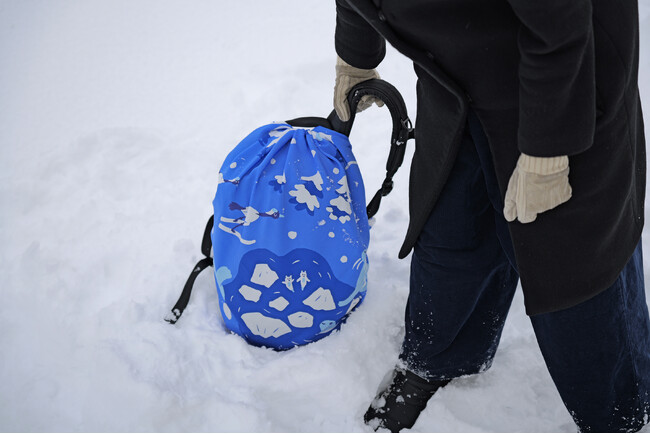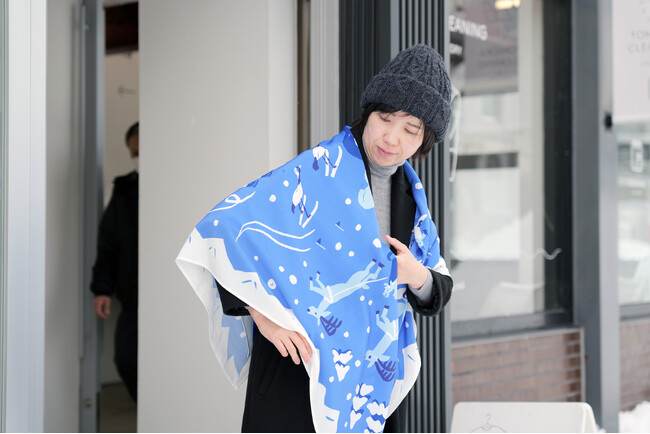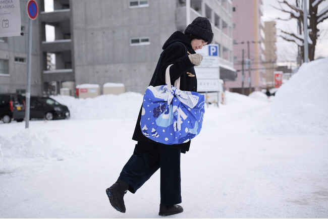 深いブルーと青みがかったグレー色は北海道の長い冬をイメージしたもので、楽しく雪遊びをしている「いきものたち」をデザイン。厳しい北海道の冬をたくましく生きる動物たちを、札幌在住のイラストレーターマット和子氏が楽しげに描いた。アシンメトリーのデザインはどこをとってもかわいらしさで溢れています。描かれた11種の中には「謎の生物」もいて、探す楽しみも生まれた。ファッションアイテムとしても目を引くデザインに仕上がりました。