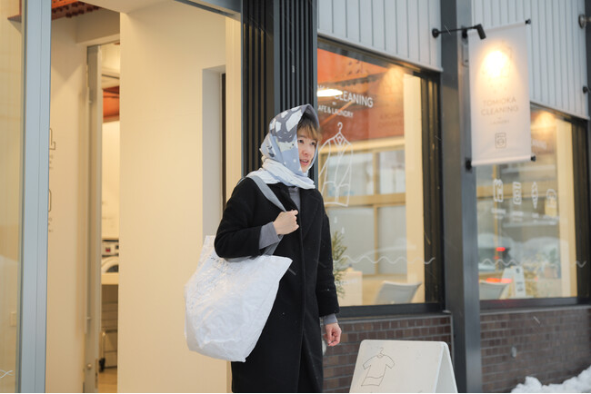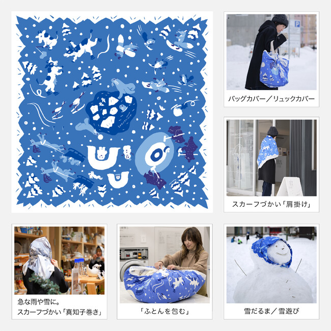 長く衣類の取り扱いに携わってきたクリーニング店として、まずは布団や衣類を汚れや水分から守ることができる127×127cmのサイズ感と超撥水性の素材にこだわった。また風呂敷本来の実用性の他に「北海道らしさ」をデザインすることで、使う楽しさ、持つ楽しさ、見る楽しさをプラスした。包む、羽織る、巻く、運ぶと、まさに多様な使い方をコミカルな動画にまとめて配信し、年代・用途問わず広く風呂敷を楽しんでもらえるよう工夫した。折り畳んでバッグや車に収納しておけば、即座に幅広いシーンで活躍。アウトドアにもおすすめです。