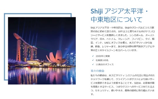Shijiの日本法人として2018年設立。ホスピタリティ業界のお客様を中心に、グローバル企業ならびに国内資本のホテルグループ等にソフトウェア・ソリューションとサポート業務を提供しています。サポート体制にも力を入れており、提案から導入、運用まで、ホテル現場の経験者が現場目線でサポート、また、ヘルプデスクは365日オープン、英語・日本語に対応し、日本語はネイティブ・スタッフが対応しています。