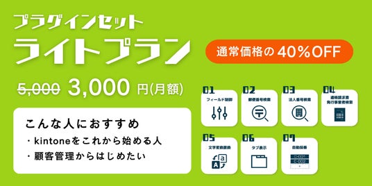 ライトプランに含まれるプラグイン/ツールチップ/アプリ間レコードコピー/アプリ間レコード更新/テーブルデータ転送/複数レコードテーブル作成/入力制御/日付/ルックアップ/プロセス管理/テーブル操作/選択肢絞り込み/添付ファイルプレビュー/関連レコード一覧/フィールド連動