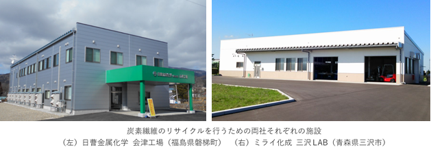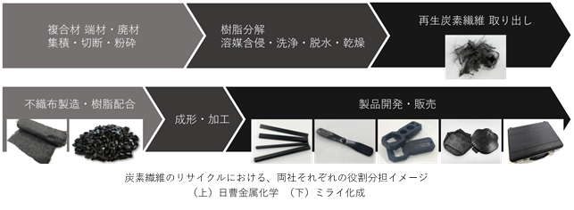 具体的には、日曹金属化学が会津工場にて複合材の端材・廃材を集積し、ミライ化成の独自技術・ノウハウを用いて炭素繊維を取り出す役割を担います。ミライ化成は、日曹金属化学にて回収・再生した炭素繊維の加工・成形に関する技術開発およびリサイクル炭素繊維の製品開発とリサイクル炭素繊維のサプライチェーン構築に取り組みます。