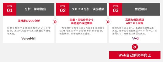 当社では、カスタマーサポートの豊富な経験と知識、独自手法の高度なVOC分析、Webサイトやデジタルマーケティング、UI/UXの豊富な経験と知識を統合して、お客様がWeb自己解決できるようにWebサイトを最適化していき、本来お客様ご自身で自己解決できる内容の問合せや入電の削減を実現していきます。