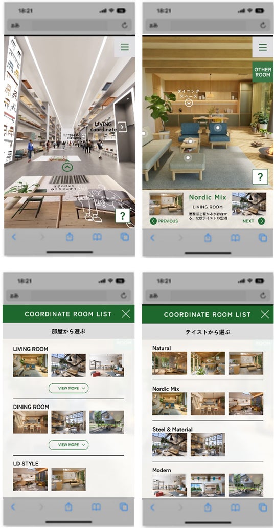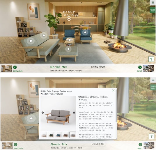 180°と360°の2種類のパノラマで、リビングルーム、ダイニングルーム、LDスタイルのシーン別と、ENENが提案する4つのテイスト「Nordic mix」「Steel and Material」「Modern」「Natural」から、ルームコーディネートを選択することができます。現在、16コーディネートを展開しており、今後、順次追加します。