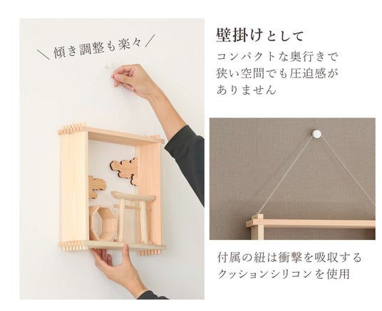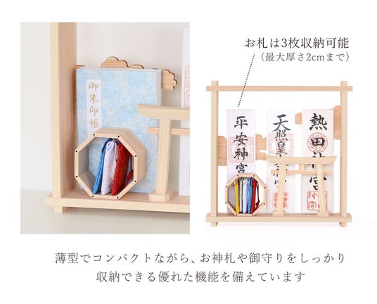 薄型のため置き型としても飾れ、最大厚さ2cmのお神札を3枚まで、一緒に御守りや御朱印帳も整理できる十分な収納力を備えています。壁への取り付けは工具不要のアタッチメントで約5分。軽量設計と衝撃吸収クッションにより、女性でも簡単・安全に設置可能です。