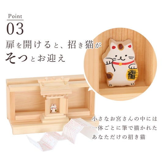 かわいさ、と厳か中心には本物の神棚さながらに、小さな神社が鎮座。伝統の雰囲気を漂わせつつ、招き猫がほんのりと微笑む「ご神体」をアクセントにしています。国内職人が筆で描き上げる「招き猫」は、一体ごとに表情が異なる唯一無二の存在。