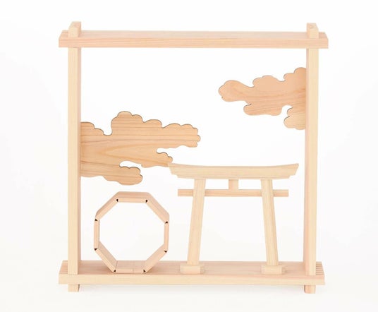 素材とデザインの調和国産・手作りにこだわり、上質な「紀州桧」を使用した機能的な神棚。赤みを帯びる木肌は豊富な油分を含み、湿気に強く変形や腐食が起きにくい素材。職人の技とデザイナーの感性で企画されました。天界を象徴する白雲に大鳥居をあしらい、四角形と八角形のフレームが神聖さと洗練を演出。シースルー構造で壁紙が背景としてなじむため、絵画のような佇まいを楽しめます。