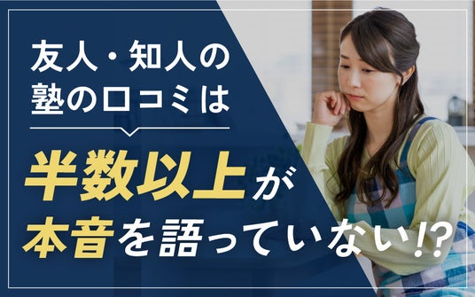 塾選びにおいて友人・知人から直接聞く口コミは重要な情報源です。実際に、当社が実施した「塾に関する調査」において、塾を知ったきっかけの約4割が友人・知人の口コミでした。しかし、塾について話したことがある人の半数以上は、話しづらい内容など本当のことを話していないと言う結果も。塾選びにおいて多くの保護者が友人・知人の口コミを頼る一方で、それだけに頼ることの危険性も見えてきました。