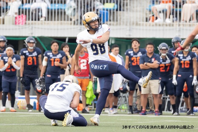 試合は序盤から両チームともディフェンスが奮闘しオフェンスを封じ込め、膠着した試合展開となり、3-0とオービックのフィールドゴール(FG)のみで前半を折り返しました。後半に入っても同じような状況が続き、第3Q、第4Qにそれぞれ、新人キッカー(K)#98中山龍之介選手(立教大卒)が距離のあるフィールドゴール(FG)を決めて9-0とし、ロースコアながら着実にリードを広げました。最後にノジマ相模原にタッチダウンを献上しましたが逆転を許さず、9-7で勝利しました。