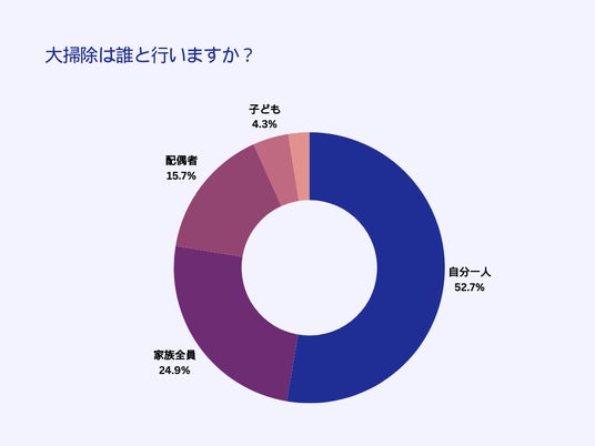 「大掃除は誰と行いますか?」と質問したところ、「自分一人」と回答した人が52.7%と圧倒的に多く、続いて「家族全員(24.9%)」「配偶者(15.7%)」「子供(4.3%)」「親・祖父母(2.4%)」の結果になりました。