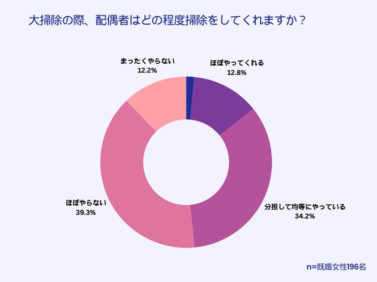 「大掃除の際、配偶者はどの程度掃除してくれますか?」という質問では「ほぼやらない・全くやらない」との回答が既婚女性の過半数を超える51.5%、「全てやってくれる・ほぼやってくれる」が全体の12.8%で、「分担して均等にやっている」が34.2%という結果になりました。